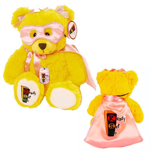 The Bear- a bright and cheerful, yellow colored bear, measuring 14 inches tall and made with only the finest fabric that has passed rigorous U.S. standards. Includes pink silky mask and a flowing pink cape.